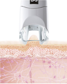 - 特許を取得しているトリートメントヘッドが生み出すリズミカルな刺激により、線維芽細胞が活性化し、コラーゲン線維やヒアルロン酸・エラスチンが増加します。これによって、肌に負担をかけることなくハリと潤いのある肌を実現することができるのです。これが、ヒアルロン酸増量術です。